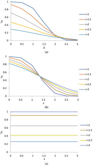 Case 3 presents shifts in the mean as well as the standard deviation. The values of k are 0(0.5)3, and the values of r are 1(0.5)3. The OC curves for the control charts of , , and with are presented in Figure 6a, Figure 6b and Figure 6c, respectively. As shown in Figure 6a,c, when mean shift k is fixed, -risk decreases with an increase in r. As shown in Figure 6a,b, when r is fixed, the probability of Type II errors decreases with an increase in k. This indicates that the newly developed process capability control charts are more sensitive to larger shifts than to smaller ones. As shown in Figure 6c, when r is fixed, the probability of Type II errors does not vary with a change in k. As shown in Figure 6b, when mean shift k is fixed, the probability of Type II errors decreases with an increase in r when k ≤ 1, and the probability of Type II errors decreases with a decrease in r when k ≥ 1.5.