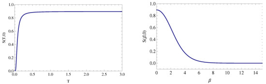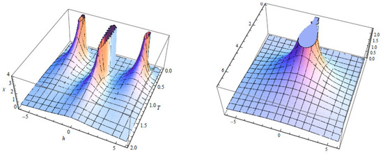 A three-dimensional plot of is given in Figure 5. Figure 5 (Left) and (Right) show the behavior of the susceptibility function given in Equation (32). For , three stacks resembling a boot are observed, and a stack appears for in the chosen region , . As seen in Figure 5 (Left), while three different susceptibility peaks appear for at low temperatures, the susceptibility peaks disappear as the temperature increases. For , only a single susceptibility peak is observed at low temperatures (see Figure 5 (Right)).