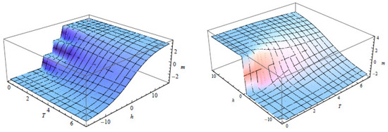 The Mathematica software (Version 8.0, Wolfram Research, Inc., Champaign, IL, USA) [23] has been used to perform the calculations and to plot the figures. A three-dimensional plot of is given in Figure 4. Taking into account the eigenvalue in the Formula (30), for , one can easily see that, as the temperature T increases, the smoothness of the function decreases and exhibits a behavior similar to the step function. On the other hand, for , the surface of the function becomes smooth. In contrast to the single-spin Ising chain’s typical single step [21], in Figure 4 (left), the magnetization graph shows three distinct steps at low temperatures. This phenomenon may be explained by spins adopting distinct states within even and odd sublattices, or by all spins assuming the same state.