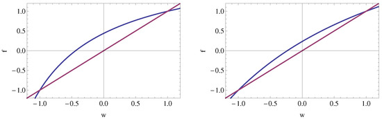 The graphs of the function f for antiferromagnetic () and ferromagnetic () values are plotted in Figure 6. The diagrams show that the function in both cases has just two fixed points. Additionally, there is only one positive fixed point. As a result, there is just one Gibbs measure and no phase transition in the model. As it is well known, the classical single spin 1D Ising model’s phase transition issue has attracted the interest of statistical mechanics researchers for over a century, and it has been established that there is no phase transition [1]. In this present paper, we demonstrated that the mixed spin 1D Ising model has no phase transition as an example.
