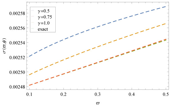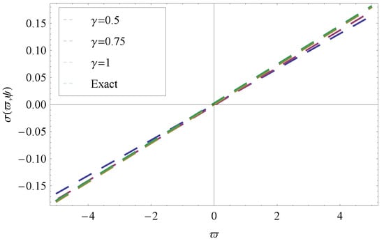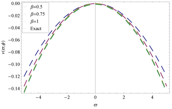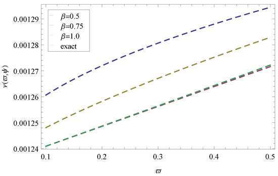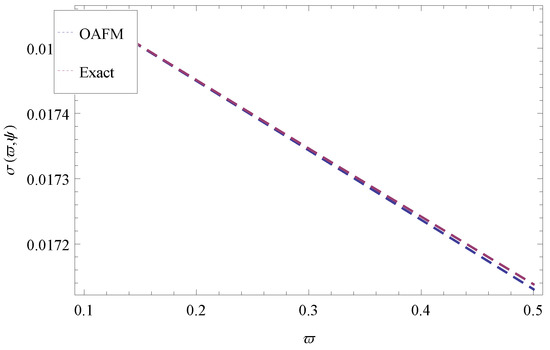 Figure 1 and Figure 3 depict 2D plots as a comparison of the exact and OAFM solutions of and for Problem 1 at . Figure 2 and Figure 4 show the impact of and on OAFM solution, respectively. Figure 5, Figure 6, Figure 7 and Figure 8 display the 3D plot of the OAFM and the exact solutions of and for Problem 1 at .