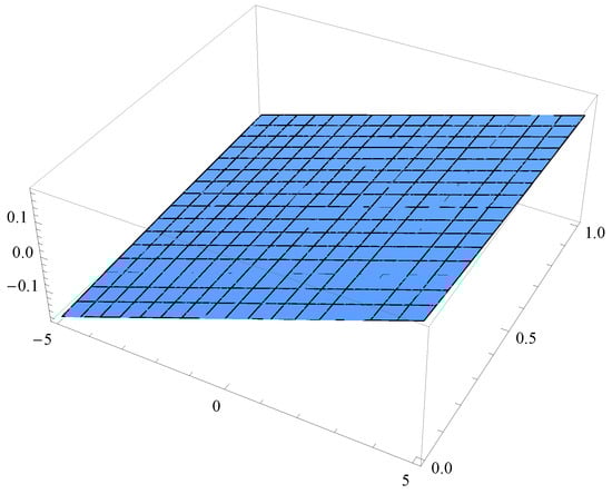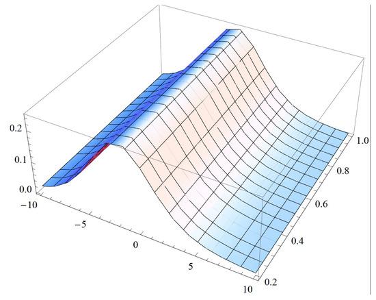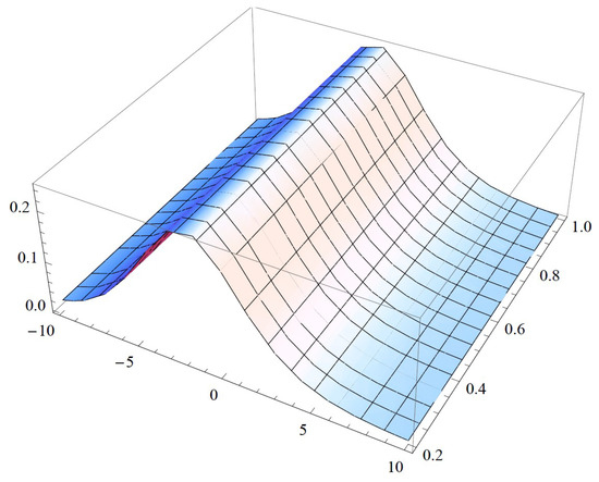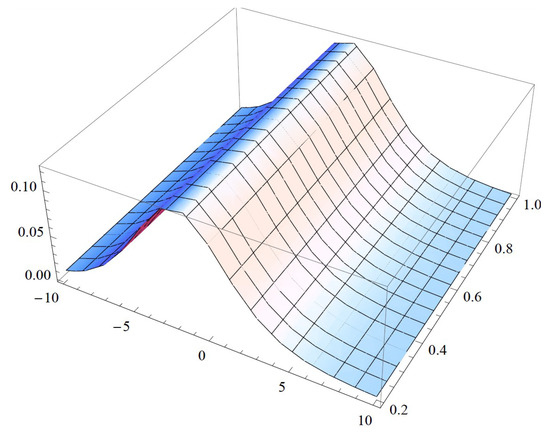 In Problem 2, Table 4 shows the different values of and for convergence control parameters. Table 5 and Table 6 show the comparisons of the absolute errors of the first-order OAFM solution with LADM for and of a coupled non-linear KDV system of time fractional equations. Additionally, Figure 9 and Figure 11 depict the 2D plots of the OAFM and the exact solutions of and while Figure 10 and Figure 12 display the 2D plots obtained by the OAFM solution of and for different values of and . Figure 13, Figure 14, Figure 15 and Figure 16 display the 3D plots of the OAFM and the exact solutions of and for Problem 2 at .