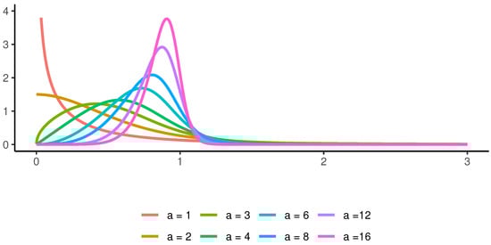 hence, the sign of determines whether increases or decreases. If , then grows, and if , then decreases. Additionally, higher values of the scale parameter result in greater dispersion of the density, while lower values of the scale parameter lead the density to concentrate more around zero. This concentration causes a decrease in the probabilities of high values of the variable, in contrast to when the density becomes more spread out.