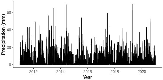 The employed time series corresponds to the daily precipitation in the city of Puerto Montt in Chile, as shown in Figure 2. This variable is measured in millimeters (mm) and is equivalent to the liters of water that have fallen per square meter. The dataset was divided into two parts: the first part was used for model estimation and covers from 1 January 2011 to 31 December 2020 with a total of 3653 observations, out of which 1648 data points are zeros. The second part consisted of the following 244 observations, of which 127 data points were zeros. The data used were obtained from the website of the Dirección Meteorológica de Chile “http://www.meteochile.gob.cl/ (accessed on 22 November 2022)”, and the records belong to the El Tepual Puerto Montt Ap Station (code 410005).