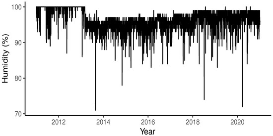 As explanatory variables, the following were used: relative humidity, measured in percentage (%); atmospheric pressure, measured in hectopascals (hPa); and temperature, measured in degrees Celsius (°C). The daily maximum values reached by these variables were used.