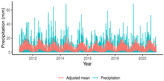 Meanwhile, (see Table 2), which is the coefficient associated with temperature and also corresponds to case (II). Regarding this, Trenberth et al. [21] mention that during the warm season over continents, higher temperatures are associated with lower precipitation amounts, while in colder seasons, lower temperatures indicate higher precipitation. Thus, an inverse relationship between temperature and rainfall would exist, but it is more related to the time of year. It is worth noting that this relationship is complex, and exceptions can occur. For example, higher temperatures could also promote cloud formation through water evaporation.