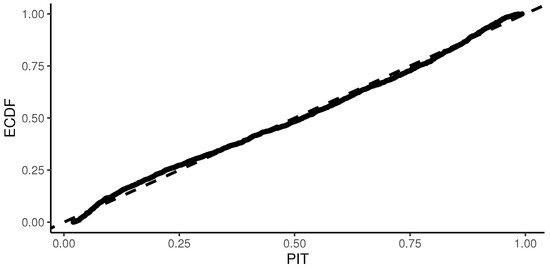 Additionally, Figure 7 indicates that the plot of PITs against the ECDF suggests that the data follow the distribution estimated by the model. This alignment is further confirmed by the Kolmogorov–Smirnov test results presented in Table 3, which verify that the model’s PITs follow a uniform distribution .