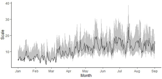 Now, it is possible to calculate the scale parameter for time , as depicted in Figure 14, which exhibits a similar pattern to that of Figure 11.