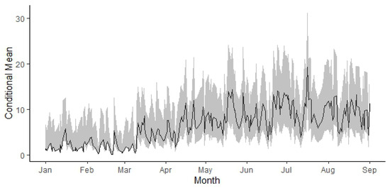 The graph for the predicted scale parameter is shown in Figure 8, and Figure 9 displays the graph for the prediction of the conditional mean , as given in (13).