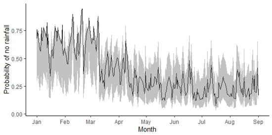 Figure 10 illustrates the predictions for the probability of no rainfall. The shaded regions represent the 95% confidence bands. Notably, .