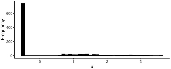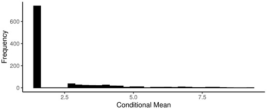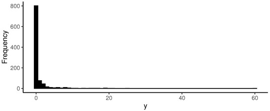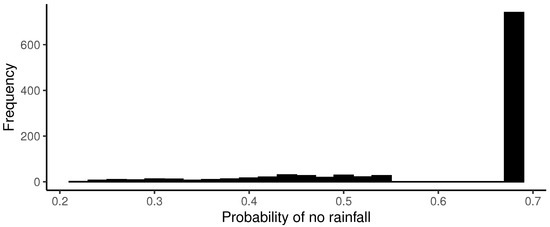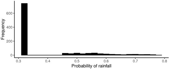 As characteristic of a zero-augmented distribution density, Figure 12 exhibits a high frequency of zeros since the probability of no precipitation is . Therefore, such a proportion of zeros was expected.
