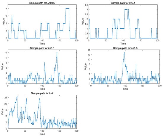 For the data generating process, using Equation (3), pseudodata are randomly generated by changing time T () and the parameter () of the error term in the observation equation. The number of replications was 100. Here, the choice of is based on the size of the signal-to-noise ratio (SNR), which is defined as the variance in relative to that in , i.e., SNR . In our model, the error of the state equation is constant. So, we consider the SNRs for 1/0.05, 1/0.1, 1/0.8, 1/1.3 and 1/4 by changing the variance in the error () in the observation equation. And these five sample paths of the TV-INAR(1) model are plotted in Figure 1, respectively. We can see that the sample path of is unsteady, and the variation in parameter combinations results in a change in the sample dispersion of the samples.