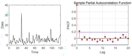 In this section, we apply the model and method of Section 3 to predict real-time series data. The data set is a count time series of offense data, obtainable from the NSW Bureau of Crime Statistics and Research covering January 2000 to December 2009. The observations represent monthly counts of Sexual offenses in Ballina, NSW, Australia, which comprise 120 monthly observations. Figure 2 shows the time plot and partial autocorrelation function (PACF). It shows that the data are nonstationary and are first-order autocorrelated, which is an indication that it could be reasonable to model this data set with our model. The descriptive statistics of the data are displayed in Table 3. Next, we compared our TV-INAR(1) model with the INAR(1) model to fit the data set. In general, it is expected that the better model to fit the data presents smaller values for -log-likelihood, AIC and BIC. From the results in Table 4, we can conclude that the proposed model fits the data better.