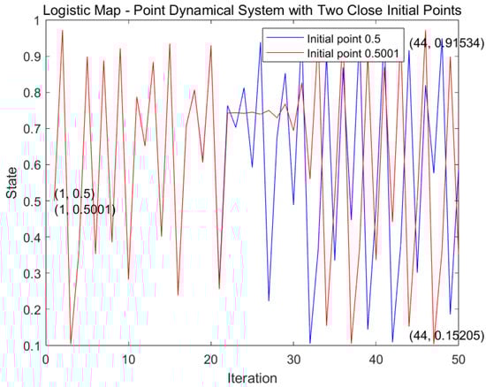 Figure 1 shows that two initial values ( 0.5 and 0.5001 ), which are very close to each other, exhibit significantly different states ( 0.15205 and 0.91534 ) after 7632 iterations under the logistic map.