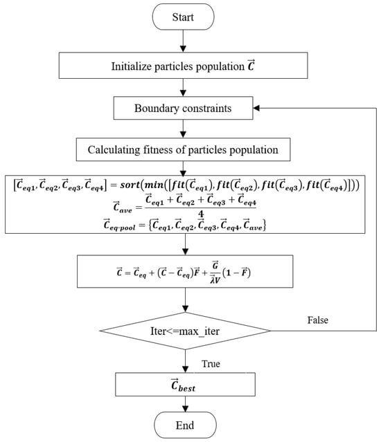 The Equilibrium Optimizer (EO) [], introduced by Afshin Faramarzi et al. in 2019, stands as an optimization algorithm, drawing inspiration from the hybrid dynamics of mass balance physics with a robust control volume. At its core lies the mass balance equation, capturing the intricate physical processes that govern mass entry, exit, and generation within the defined volume. Notably, the EO effectively surmounts the challenge of converging to local optima, achieved through its implementation of a candidate pool mechanism and the multi-directional updating attributes. When juxtaposed against genetic algorithms and particle swarm optimization algorithms, the Equilibrium Optimizer boasts heightened optimization prowess and swifter convergence rates. The algorithmic workflow of EO is depicted in Figure 1.