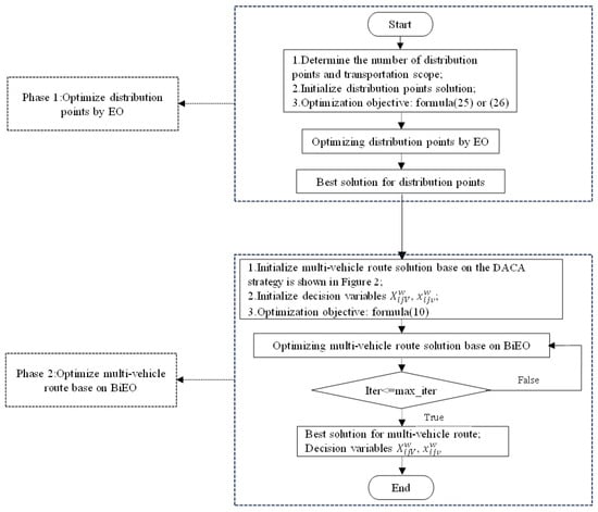 The optimization objective function is the lowest distribution cost as shown in Formula (10). In multi-vehicle combination transportation, there are three important constraints: 1. All demand points have to be distributed, Formula (11); 2. The total load of all transportation vehicles must not exceed the demand point’s demand, Formula (12); and 3. The starting and ending points of all transportation vehicles must be distribution points, Formulas (18)–(21). The DACA strategy and BiEO proposed in this paper are utilized in route optimization under multi-vehicle combinations.