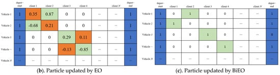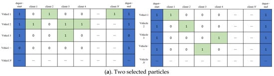 The original EO’s population update has the potential to inadvertently breach the constraint that each demand point must be traversed by a single vehicle only once. Figure 4a,b provide an illustrative instance of such an update. In the figure, the depot represents distribution points, and the client represents demand points. In Figure 4a, the two matrices depict the chosen individuals prior to the update, whereas the matrices in Figure 4b portray the outcomes following the population update. Notably, the results displayed in Figure 4b conspicuously violate the stipulated constraint of singular point passage (evident through the emergence of multi-values within the same column), subsequently forsaking their binary-coded 0 s and 1 s representation. Consequently, this renders the accurate evaluation of the fitness function impracticable during subsequent assessments. To address this predicament, enhancements are introduced to the equilibrium optimizer to ensure that the result updates adhere to the prescribed constraint conditions.