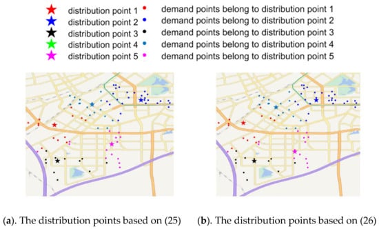 As shown in Figure 5b, the location results of distribution points with weights are different from those without weights. Meanwhile, in subsequent experiments, it was shown that weighted distribution point location selection can lower the cost of subsequent route optimization.