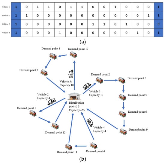 Figure 6 shows the best solution for vehicle assembly combination and it’s the delivery route. Figure 6a shows the best solution of the No. 3 distribution point, where 1 in the first and last columns indicates that the distribution point is the starting and ending points of the vehicle, and 1 in the middle of the first and last columns indicates passing through the demand point; 0 indicates not passing through the demand point. Figure 6b shows corresponding vehicle routes in Figure 6a.