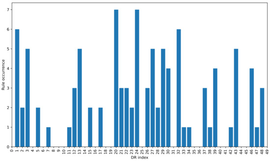 The frequency of selection of the individual DRs when creating ensembles of size 10 by the heuristic methods is shown in Figure 2. The figure shows that certain DRs are selected more frequently than others, which is to be expected since all construction methods use quite similar strategies to select DRs. The fact that some rules are selected more frequently than others seems to indicate that they are favoured by different heuristic selection methods, regardless of the different strategies used to select them. This suggests that there is some overlap between the features, meaning that a rule is considered good based on different features.