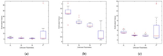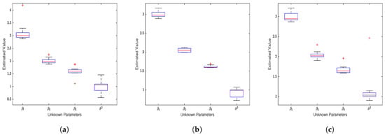 Unregularized estimation on Gaussian noise data (). (a) Estimates of the four unknown parameters in the SEM model based on the exponential squared loss function. (b) Estimates for the four unknown parameters based on the squared loss function. (c) Estimates for the unknown parameters based on the absolute value loss function.
