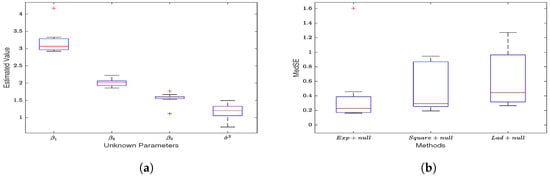 In this section, we use the SEM model to estimate the data with outliers in the response variable without regularization. (1) Similar to Table A1, all three loss functions provide reasonably accurate estimates for and , and as the sample size increases, the estimates get closer to the true values. Furthermore, the exponential loss, in particular, provides better estimates for and than the other two methods. (2) When ignoring the spatial effect of the model’s error term, the SEM estimates for the coefficients and noise variance are not accurate, and MedSE increases significantly compared to when . (3) By comparing Figure 1a with Figure 4a, it can be observed that the exponential square loss demonstrates better resistance to the influence of noise in the observed values. Additionally, through Figure 4b, similar results to Figure 2 can be observed, further highlighting the robustness advantage of the exponential square loss.