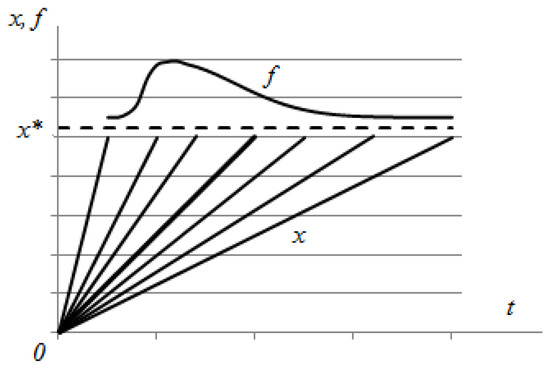 If function is sufficiently smooth in some domain of its arguments, then, in the case of the following initial condition according to the Cauchy–Lipschitz–Horowitz theorem [22,23,24], there is a single solution to each of the equations presented in the second column of Table 1. These solutions are provided in the third column of Table 1.