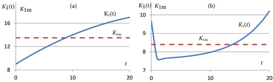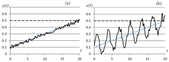 Note that Equation (1) is known in the scientific literature as the stochastic differential equation driven by a Brownian motion. The KP is considered as a random process, and its value at the initial moment of time is determined using the distribution law function . We can assume that there is an increase in KP in the process of operation and degradation of ME. KP may have a monotonic character (the absorbing boundary problem shown in Figure 3a), or non-monotonic character (the transparent boundary problem shown in Figure 3b) [15,21].