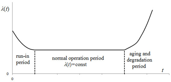 It is required to construct a probabilistic model of degradation and failures, whose parameters have a correct physical meaning. The model should make it possible to simulate the degradation and aging processes of modern and advanced ME made of heterogeneous materials (due to the dependence of coefficients and both on time and on KP ). The model should take into account basic physical and chemical regularities underlying degradation processes (aging processes of ME nodes and elements) leading to failure. In particular, the developed model must adequately describe the function of failure rate , which has a classical U-shaped standard form, presented in Figure 4.