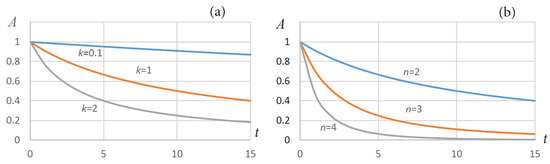 Dependence of concentration of reacting substances on time: for different values of the rate of chemical reaction (a); for different values of the order of chemical reaction (b).