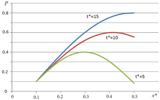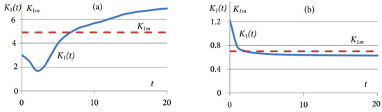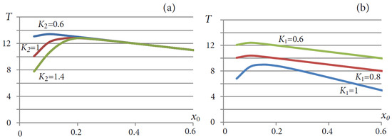 The dependence of mean time T, needed for KP to reach its limit value , on initial value , for and for different values of , is shown in Figure 12a. The case of and different values of is shown in Figure 12b.