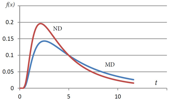 A standard graphical representation of distribution density function f(t) for MD distribution and ND distribution is shown in Figure 8.