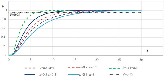 Dependences between probability P of reaching the KP limit value and the operation time for different values of parameters and (at , ) are shown in Figure 10. The dotted line shows confidence probability P = 0.95. It is clear that an increase in parameter (at ) reduces the time to the confidence domain. The increasing parameter (at ; ) increases the time to the confidence domain.