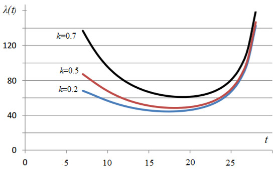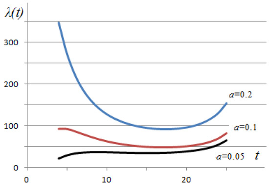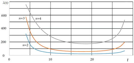 Hence, to determine the probability density function of random variable of time before failure, it is necessary to obtain the expression for by solving Equation (4) having appropriate initial and boundary conditions. Further, it is necessary to find the partial derivative of function with respect to time and integrate the obtained expression with respect to parameter . To construct function , it is necessary to integrate function within the appropriate limits. The failure rate is calculated using the following formula: .