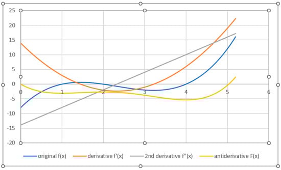 For a numerical illustration, consider the cubic polynomial with three roots (40) and their mean value of 7/3. Its derivative is a quadratic polynomial with two roots (41), and their mean value is also 7/3. Its roots define the locations of the minimum and the maximum of the cubic curve. The second derivative yields a linear function with one root (it corresponds to the third derivative in (32)), which indicates the position of the inflection point, which equals 7/3 too. Integrating the function (40) produces the antiderivative (42) as a quadric polynomial, with the mean value of roots equalling 7/3 as well. Thus, the means of all these functions are kept constant and equal. These four polynomials are presented together for comparison in Figure 1.