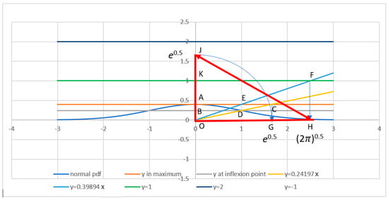 Figure 2 presents the bell curve (59), with its centre at the point O of the beginning of coordinates, the maximum value (62) at the point A, and the inflection point D (64) at x = 1. Let us describe an interesting geometric property on this curve.
