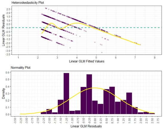 For the Linear GLM model, the dependent variable was assumed to be a metric, considering classes to in the study as values from to , as follows: , , , , and . It could be argued that, for this type of estimation, the use of regression techniques for discrete variables (for example, Poisson, Gamma, Poisson-Gamma) would be more useful, as discussed in Section 5, in which the proposition of classes from to in the research was made by prioritizing the homogeneity of the number of HEIs in each category. As such, calculating the density probability of the phenomenon, when in metric form, would show a curve similar to that of a uniform distribution, creating difficulties for the regression models for the count data mentioned above.