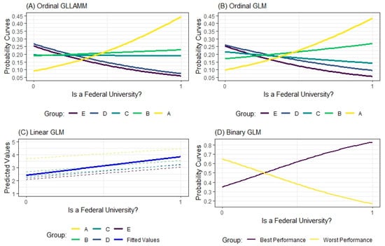 Therefore, this research is motivated by the current and latent need to disseminate ordinal logistic regressions to young researchers as well as to remind more experienced researchers of their existence. Moreover, the aim was to demonstrate the advantages of considering the contexts (nestings) that exist in the data. In the words of Bauer and Sterba [7] (p. 374), researchers may be reluctant to use multilevel models for two main reasons: (1) they felt more familiar with linear fixed-effects models and, as such, were unsure of how to interpret non-linear models; (2) it is not always obvious to practitioners in the field that ordinal multilevel options exist, and there is a gap in the literature regarding the definition of an ordinal variable [1,3]. This raises questions regarding which functional forms should be used to model a phenomenon that behaves in an ordinal manner.