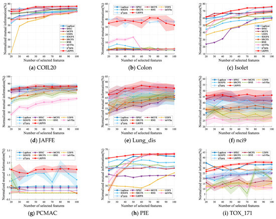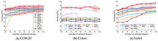 To further investigate the effect of the number of selected features on LRPFS, the clustering performance of various methods is illustrated upon different numbers of features as shown in Figure 3 and Figure 4, where the horizontal coordinate indicates the number of features selected according to the FS methods, the vertical coordinate denotes the clustering performance and the shaded section represents the error range of ACC and NMI. It can be explicitly observed that the curves of LRPFS are mostly uppermost, especially on Colon, PCMAC, and PIE, which achieves a satisfactory performance and demonstrates the superiority of LRPFS over other compared methods.