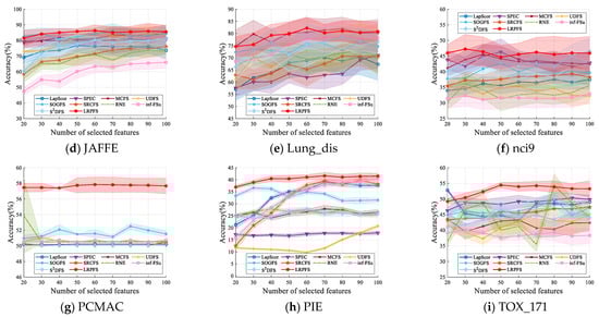 - RNE, SOGFS, and LRPFS exhibit commendable performance, affirming the importance of capturing the underlying manifold structure inherent in the data. Notably, SOGFS outperforms RNE across some datasets, especially on JAFFE, Lung_dis, nci9, and PIE. This distinction can be attributed to SOGFS’s incorporation of an adaptive graph mechanism, thereby engendering more precise similarity matrices. Unlike the aforementioned two techniques, LRPFS introduces the refinement of attribute scores to mitigate the harmful impact of noise while preserving the inherent data structure. This distinctive attribute underscores the superiority of LRPFS to a certain degree.