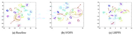 The feature subset obtained from the feature selection method on the COIL20 dataset is visualized using t-SNE. In our experiments, a comparative experiment is conducted with the Baseline, S2DFS, and LRPFS methods. For the baseline method, all features are selected as feature subsets to represent the original dataset. For both S2DFS and LRPFS, the top 100 features are selected as feature subsets. The experimental results correspond to Figure 6a–c, respectively. It is obvious that in Figure 6a,b, the inter-class distance in regions A and B is very small, which means that baseline and S2DFS fail to distinguish different classes clearly, whereas, in Figure 6c, our LRPFS succeeds in enlarging the distance of different classes. Especially, when the coordinate scales are the same as in Figure 6c, the overall spatial structure of LRPFS remains consistent compared to S2DFS, which further verifies that the potential relationship penalty term can explore the uniqueness of the samples to maximize the inter-class distance while preserving the spatial structure of the data and selecting more discriminative features.