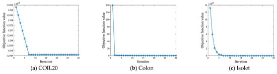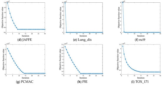 To empirically demonstrate the convergence of LRPFS, convergence curves for nine datasets are depicted in Figure 7, where the horizontal axis represents the number of iterations and the vertical axis denotes the objective function values. From these plots, it is observed that the curves of the objective function exhibit significant and rapid variations, particularly in the Colon, Isolet, Lung_dis, and nci9 datasets, and convergence can be achieved within 15 iterations on all datasets. This observation serves as evidence that LRPFS achieves effective and stable convergence across all datasets, which further validates the correctness of the theoretical convergence proof.