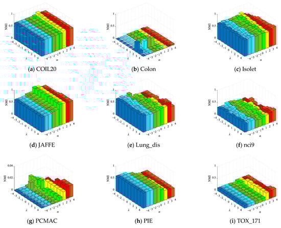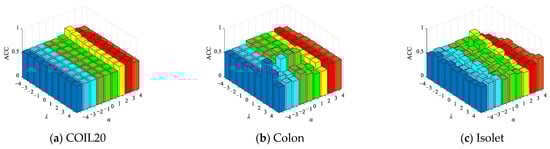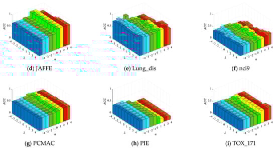 LRPFS involves parameters , , , and . Among them, parameters and are associated with constructing the sample attribute scores, which have an indirect and slight influence on the algorithm. Therefore, we mainly conduct parameter sensitivity experiments on parameters and . We fix , , and adjust the range of parameters and in {10−4, 10−3, 10−2, …, 102, 103, 104}. The 3-D grids of ACC and NMI are displayed under different parameter values on test datasets as shown in Figure 8 and Figure 9. As can be observed on most of the datasets, the values of ACC and NMI are positively correlated, and the clustering results are comparatively stable with the varying parameters. In particular, in these datasets where the number of samples is larger than the number of features. For example, COIL20 and PIE, has a minor impact on the clustering performance of LRPFS than . However, on Colon, nci9, and PCMAC where the number of features is larger than the number of samples, LRPFS is more sensitive to . The reason may lie in that latent relationship penalty mining plays a more significant role in guiding feature selection when the number of sample features is larger. In a word, the parameters and both play an indispensable role in LRPFS in that the feature selection mechanism of LRPFS can perform efficiently under the combined influence of latent relationship penalty and sparse constraints. Meanwhile, the experiment verifies that the parameters and are suitable for 12 benchmark datasets in the range of {10−4,10−3, 10−2, …, 102, 103, 104}, which provides a suitable parameter reference range for LRPFS in practical application.