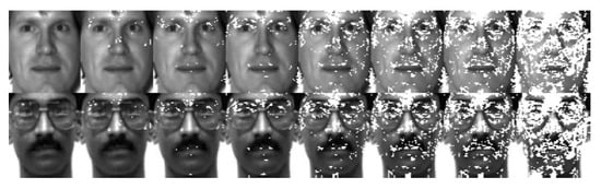 On the Yale64 dataset, the selected features of LRPFS are visualized. In our experiments, two samples are randomly selected from the Yale64 dataset and select {0, 50, 100, 200, 500, 800, 1000, 2000} features from the selected samples under LRPFS, and the selected features are displayed in white pixels, which correspond to the images from left to right in the illustration in Figure 10, sequentially. It can be observed that when 50 features are selected, the selected features are mainly concentrated in hair, eyes, and nose, whereas the selected features appear in the mouth when the selected features are increased to 100 so that the features of hair, eyes, and nose are more discriminative than the mouth in Yale64 dataset. As the selected features gradually increase, the selected features are mainly divided into hair, eyes, glasses, nose, mouth, beard, etc., which is consistent with the perception of selected features for face recognition. Thus, it is demonstrated that LRPFS can effectively identify discriminative features and reasonably evaluate feature scores.