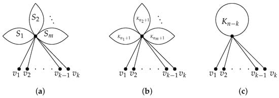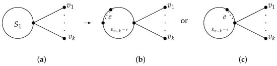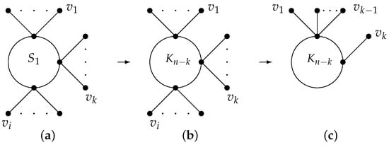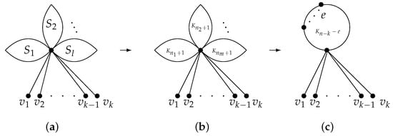 If , add some edges to of to obtain the complete graph ; by adding edges among , we can obtain the graph . Finally, we can obtain the graph by applying the graph transformation III on , and we can obtain the graph by adding an edge to (Figure 10). Then, according to the above lemmas, it holds that .