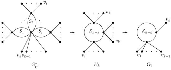 If , edges are initially added to the vertices of the which is a 2-edge-connected subgraph, and it is converted to , denoting the graph as (See Figure 8). By applying Lemma 1, we obtain . Next, repeating the graph transformation III on graph H, at last we obtain . If we move only one edge from , it becomes . By repeating this transformation in the graph, each pendent edge is attached to the same vertex. Via Lemma 4, we have