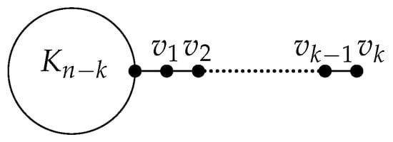 Let be a complete k-partite graph with a partition set differing in size by no more than 1. Let be the graph in which a vertex of a a complete graph is connected to a path graph (see Figure 11). Next, we will prove that the graph and the tadpole graph has a maximal and minimal Sombor index in , respectively.