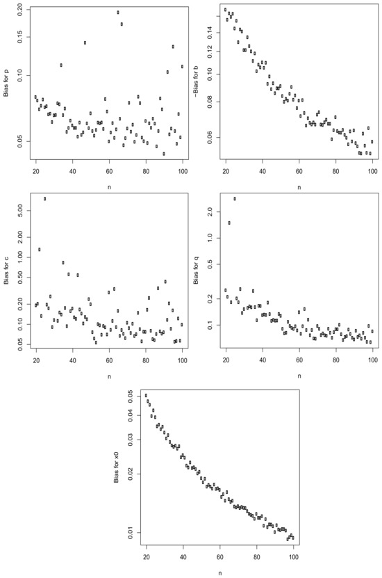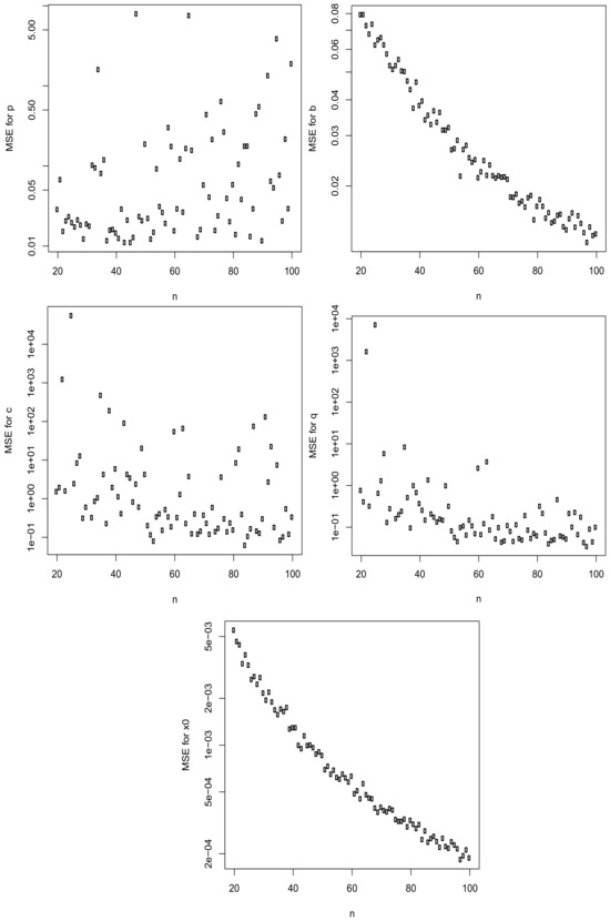 With the exception of p, the biases approach zero as n approaches 100. The biases appear positive for p, c, q and . The biases appear negative for b. In terms of magnitude, the biases are smallest for and largest for c and q. With the exception of p, the mean squared errors approach zero as n approaches 100. They are smallest for and the largest for c and q. The biases and mean squared errors appear small enough for b, c, q and for the n close to 100.