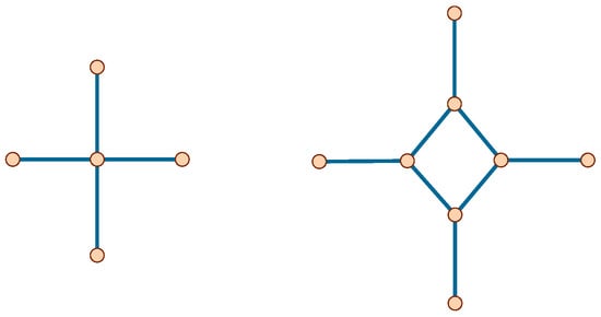 Theorem 2, in particular, allows us to analyze various special cases of graphs, such as the following. The spectrum of the left graph in Figure 2 contains the full spectrum , but does not have a divisor and, therefore, is not a consistent vertex quadrangulation. It also turns out that the graph O of the octahedron is not a graph from the class at all, since traversing SAW paths in it splits O into three pairwise intersecting SAC 4-cycles. This does not satisfy the definition of the class , since it does not allow finding two complementary spanning graphs and , all of whose components are SAC cycles, as it should be satisfied for the graph .
