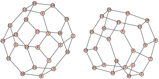 As an example, we note that the skeleton graph of the truncation [28,29] of any polyhedron with a 4-regular skeleton graph P is also a vertex quadrangulation of P; see [24] and Figure 2, left. Other examples are a rhombitruncated cuboctahedron and a rhombitruncated icosidodecahedron.
